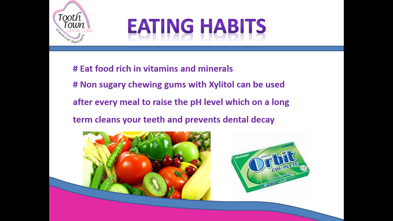 Avoid snacking between meals. Opt for food rich in Vitamins and Minerals. If you are more fond of sweets and chocolates you can have it along with your meals. Non sugary chewing gums with Xylitol can be used after every meal to raise the pH level and quantity of saliva which on a long term cleans your teeth and prevents dental decay.