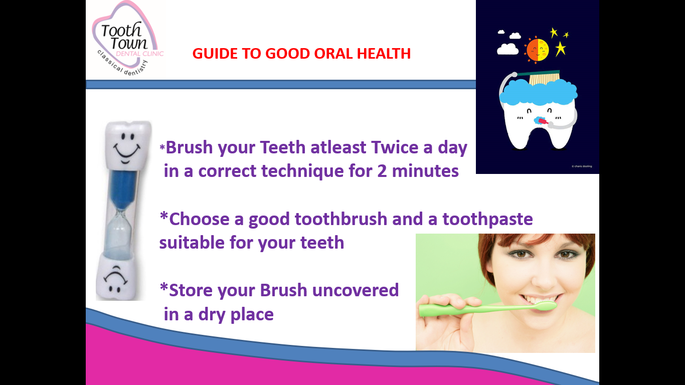 Brushing is done mainly to remove plaque which is a collection of bacteria. Plaque forms within hours, so brushing twice a day is a must. Type of brush is basically choice of the individuals. However, hard bristled ones and horizontal vigorous brushing should be avoided. Proper brushing technique should be followed. Otherwise, there will be loss of enamel and recession of gums. Change your brush once the bristles widen or every 3 months. You can use electric brushes for efficient cleaning.